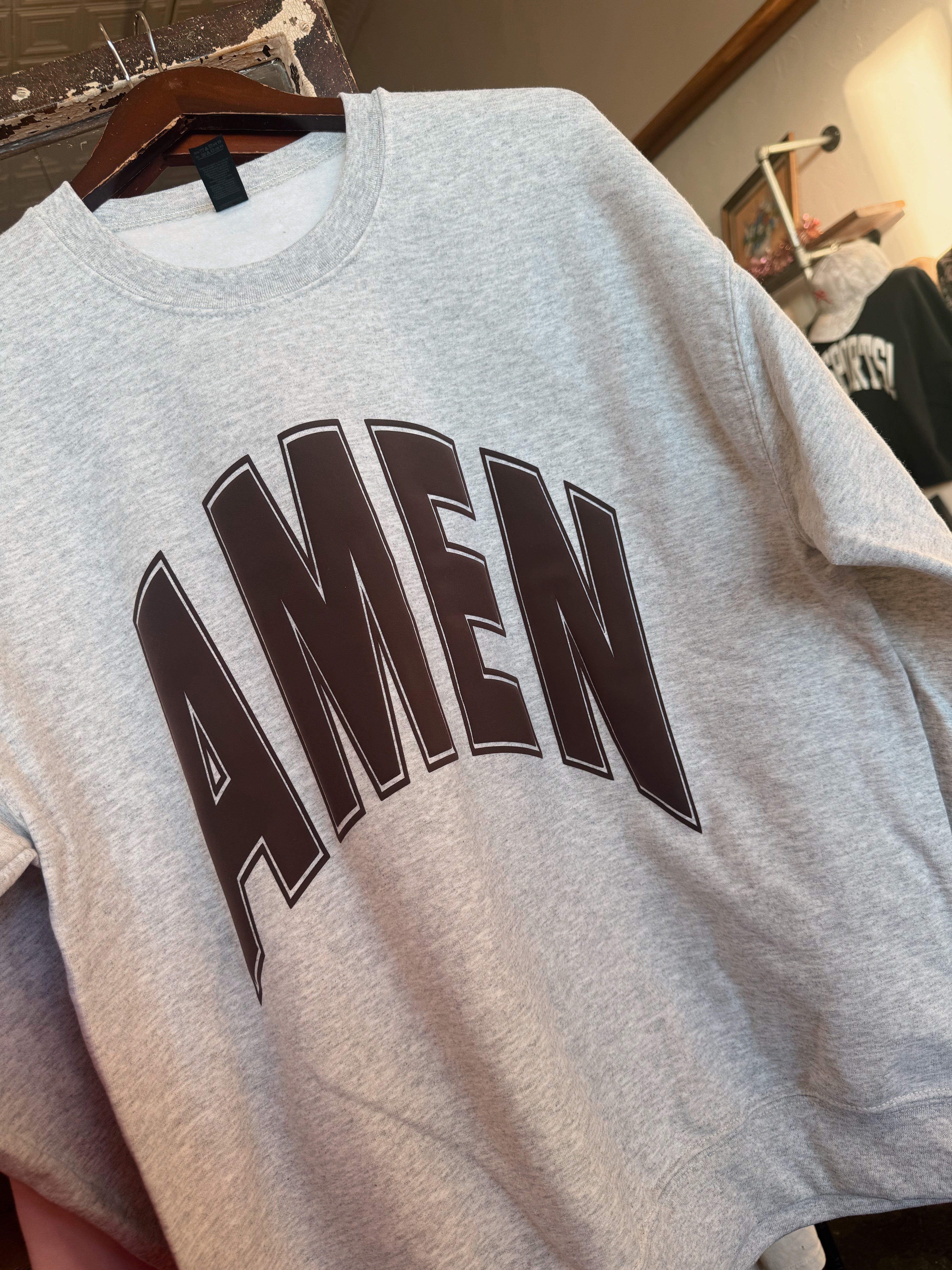 BROWN puff print on ash sweatshirt